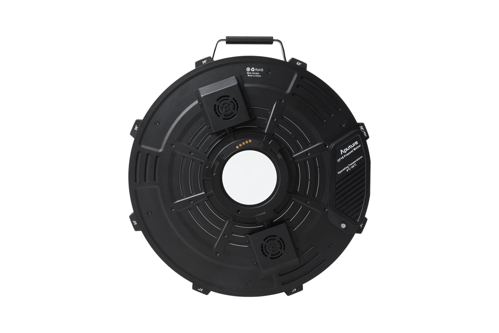 The Motorized CF16 Fresnel is a compact motorized Aputure Mount fresnel with a 16-inch diameter lens and a spot-flood range of 18º-50º. It is designed for use with the STORM XT52. The Motorized CF16 Fresnel efficiently intensifies the native light output of the STORM XT52 by up to seven times. It provides a smooth falloff from center to edge, all with a compact and lightweight form factor utilizing an internal focusing system. This unique system allows the Motorized CF16 Fresnel to increase the distance between its rear and front elements internally, maintaining a consistent and compact overall size. With its built in motorized focusing system, the Motorized CF16 Fresenel can be precisely controlled at the fixture’s lamp head or remotely via Sidus Link, Sidus Link Pro, or a lighting control console via DMX. The Motorized CF16 Fresnel can be paired with the included CF16 Barn Doors to give users more shaping control over the output of their STORM XT52. The 8-leaf barn doors also include a holder for a scrim. For additional convenience, the Motorized CF16 Fresnel and its CF16 Barn Doors fit into the CF16 Flight Case for storage and transportation. A separately available CF16 Fresnel Manual Focus Cover is available for users who wish to operate the Motorized CF16 Fresnel manually. This cover plate must be installed to operate the CF16 safely as it drives the fresnel’s onboard fans and maintains the unit’s IP65 rating.