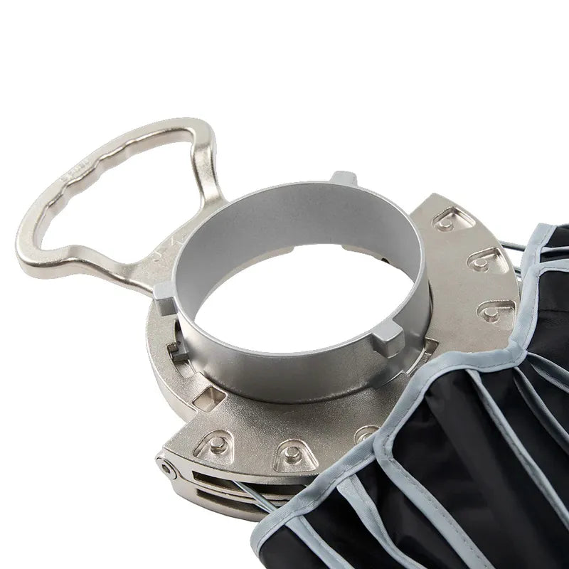 The Quick Dome 90 is a 90cm (3ft) circular Bowens mount softbox built for fast, reliable light shaping on set. Its quick release latch mechanism allows users to tension the steel support rods on the speed ring within seconds, streamlining both setup and teardown. The extended lateral side handle makes mounting and unmounting easy and controllable, and Quick Dome 90 packs flat for storage and transport. Includes 1 and 2-stop diffusion, internal baffle, and 40° light control grid.