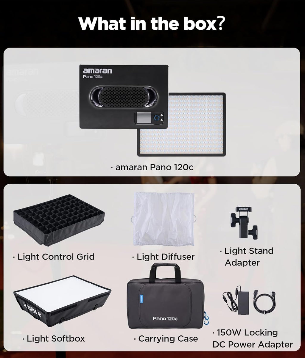 The amaran Pano 60c & 120c Kits include essential light-shaping tools to create your best content anywhere. Each kit includes a Softbox, Light Control Grid, Diffuser, Ace Lock to Light Stand Adapter, and Power Adapters & Cables, all packed in a protective Carrying Case. For even more portable power, the Pano 60c 2-Light Kit adds two folding 2m light stands, ensuring you’re always ready to create, whether in a studio or travelling to your next location.