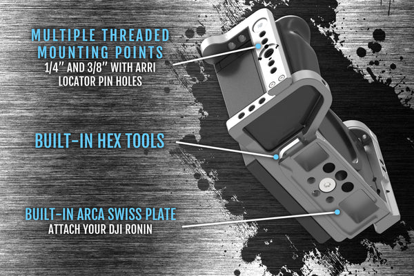 • Removable Arca Swiss Plate on the bottom of the cage, allowing compatibility with the new DJI Ronin.